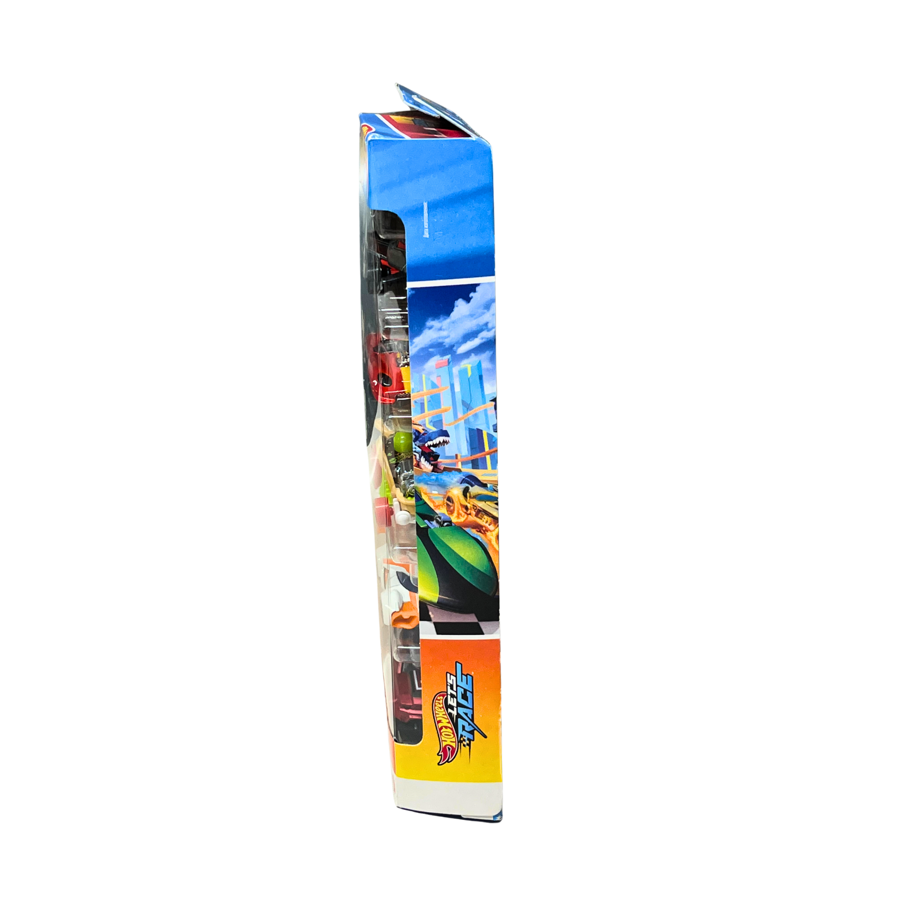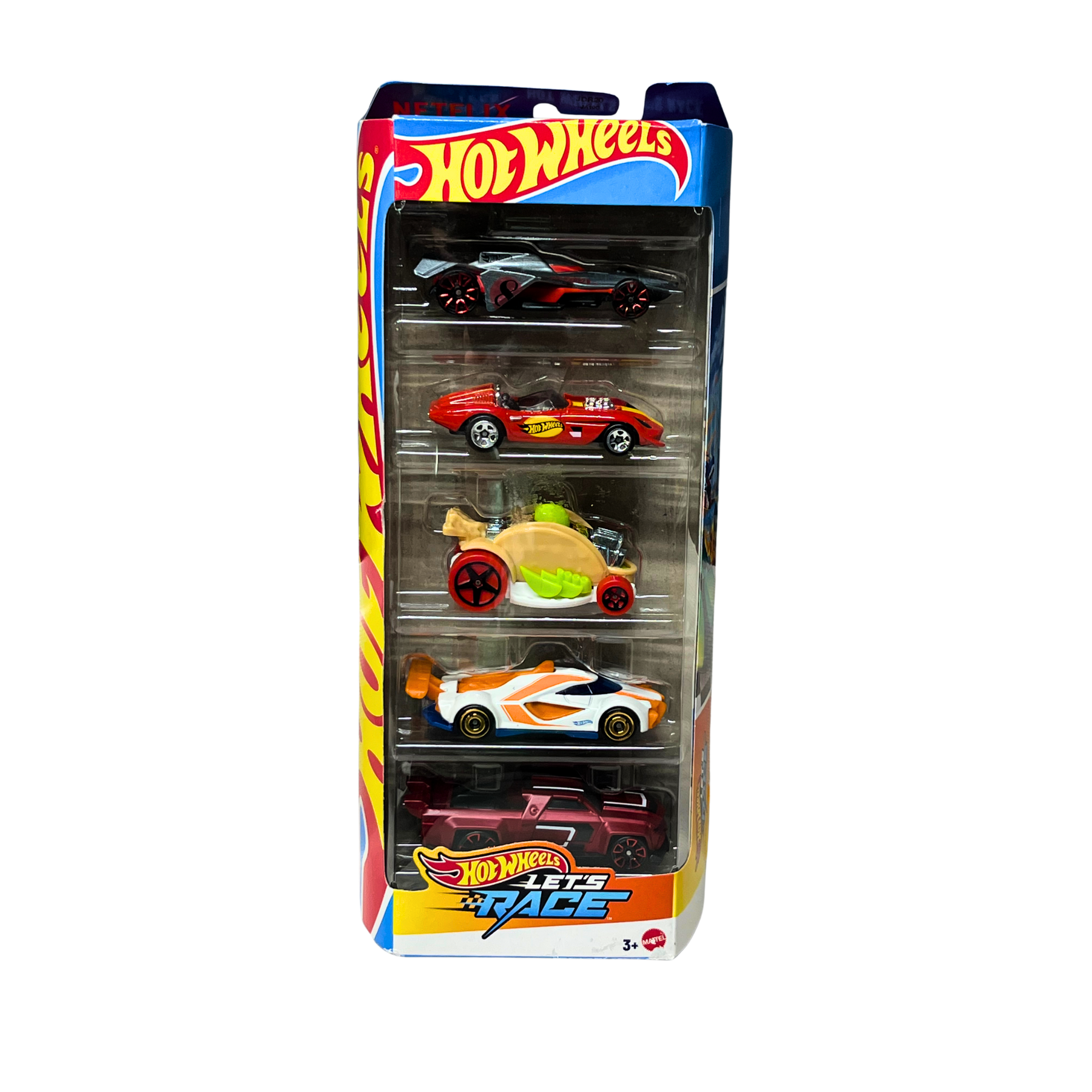 Hot Wheels Let's Race 5-pack. Has 5 cool cars in original packaging. Includes Bad to the Blade, Glory Chaser, Car-de-Asada, Mach Speeder, and Solid Muscle.