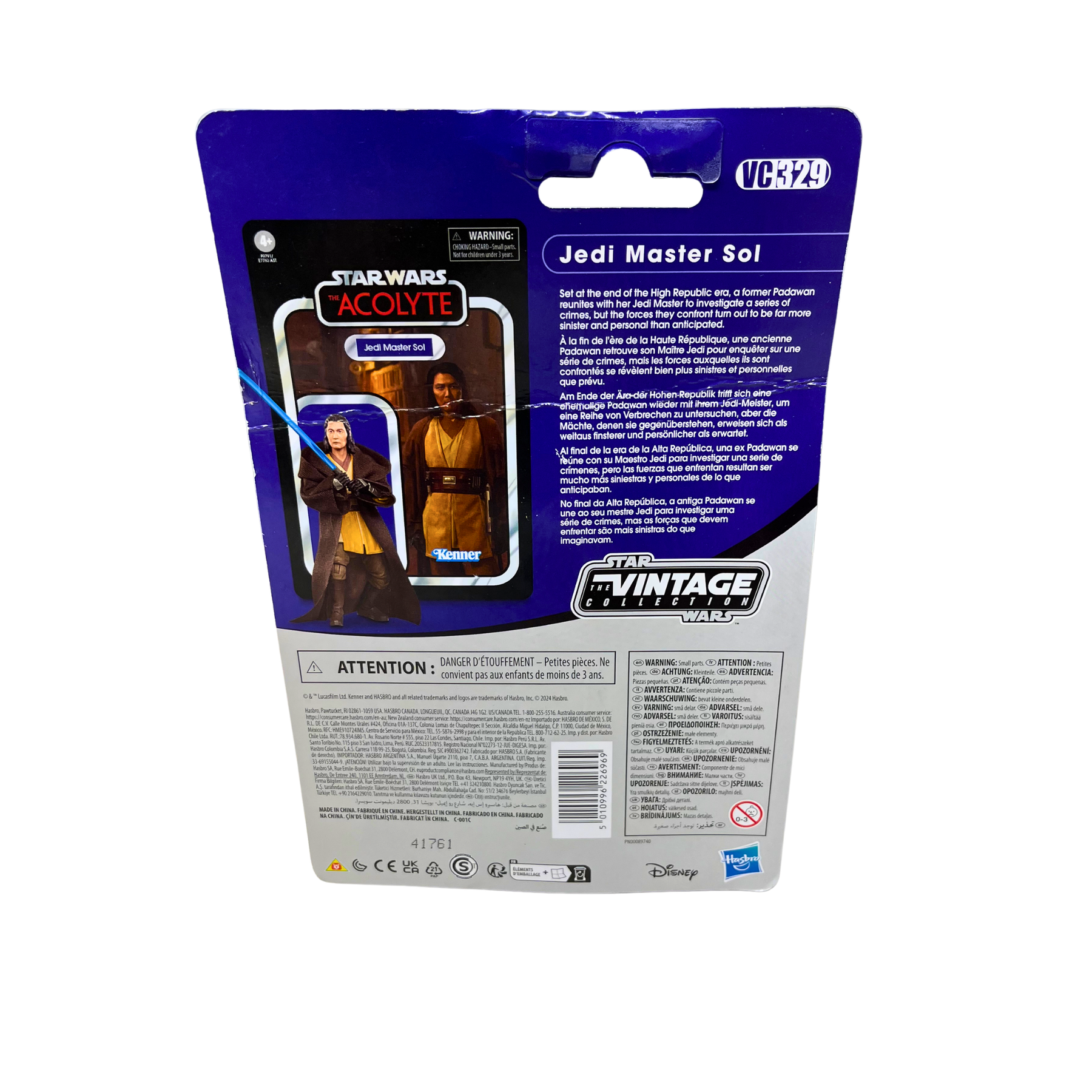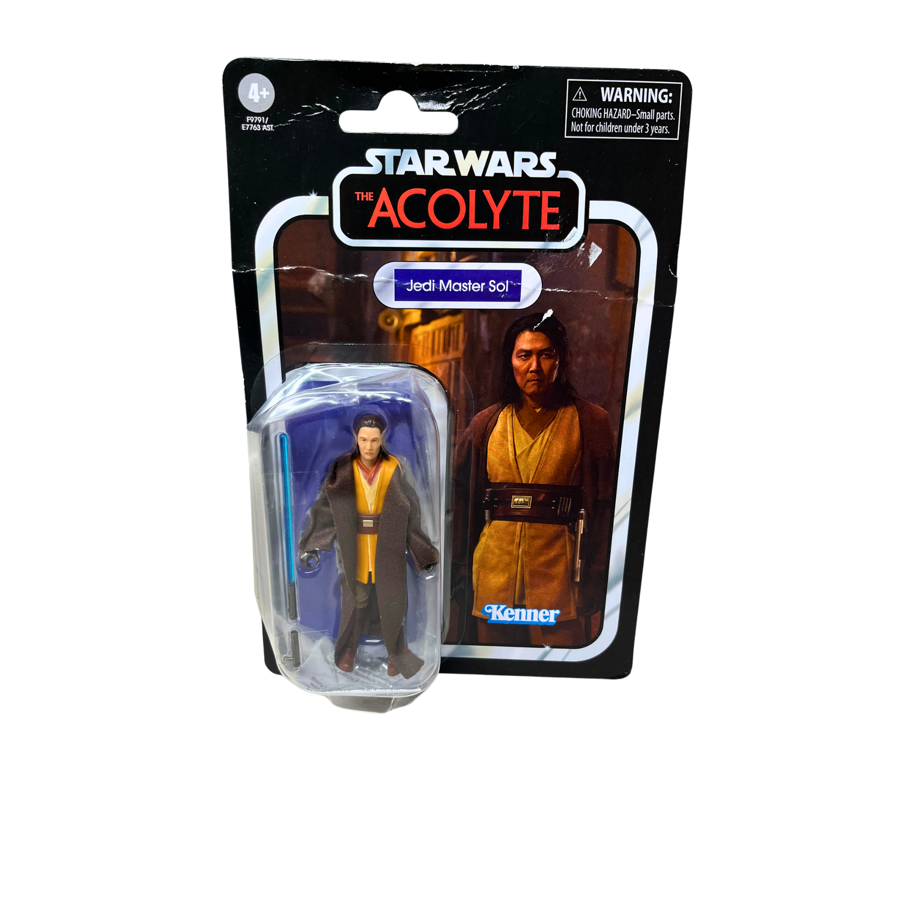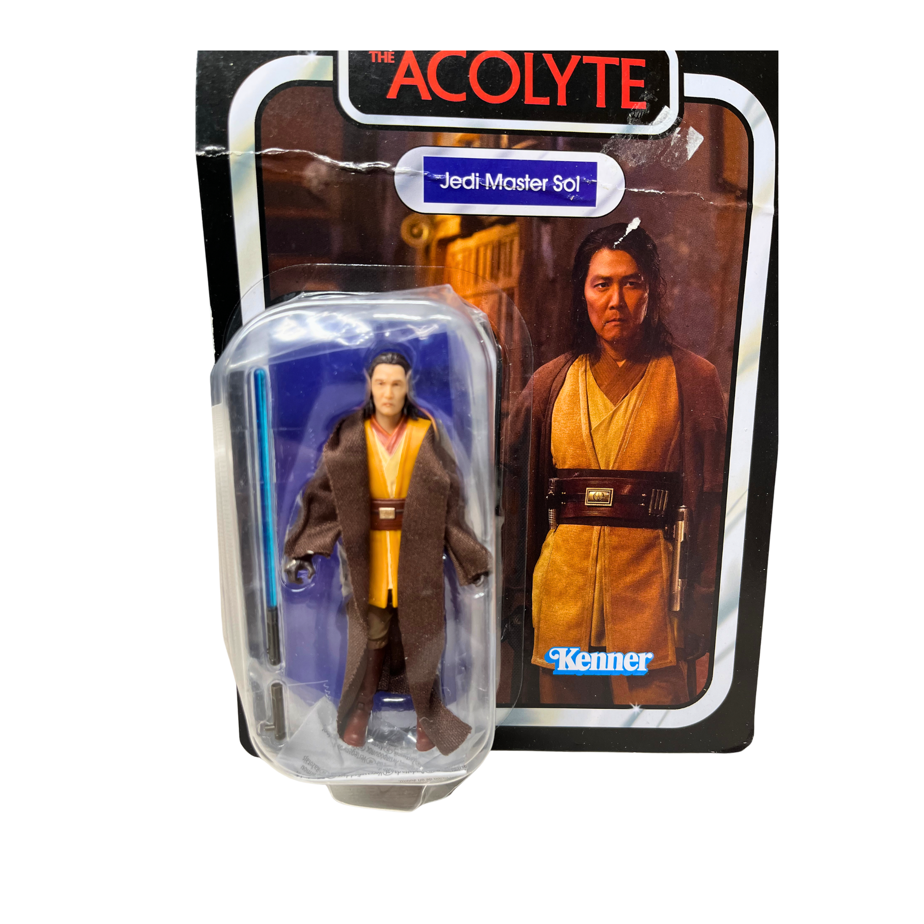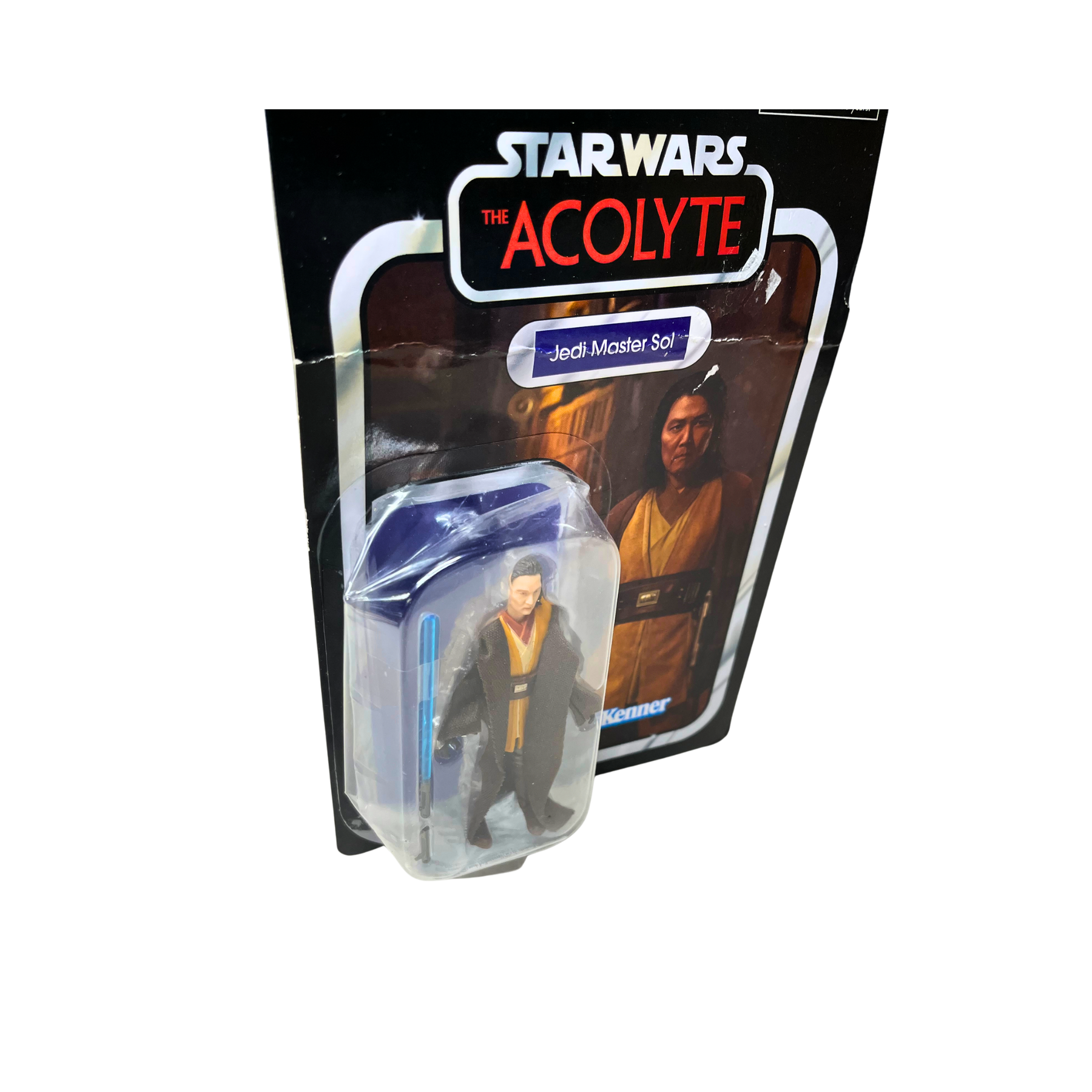 Jedi Master Sol from Star Wars: The Acolyte, captured in Kenner's Vintage Collection style. This sealed, never-opened figure remains in its original packaging. Package shows wear and some damage on the plastic covering. Perfect for fans of the series and collectors seeking rare Star Wars memorabilia from this era.