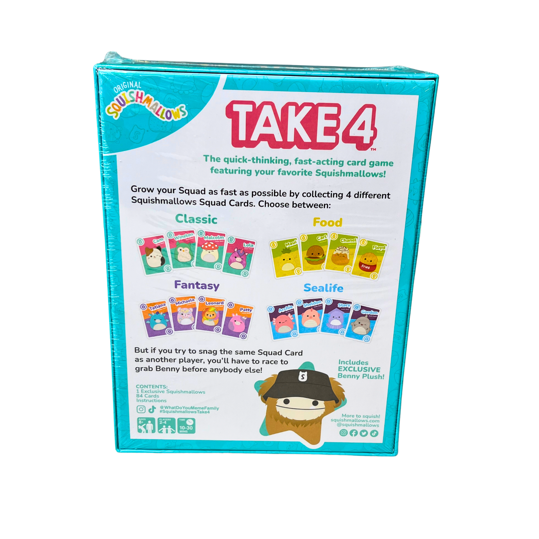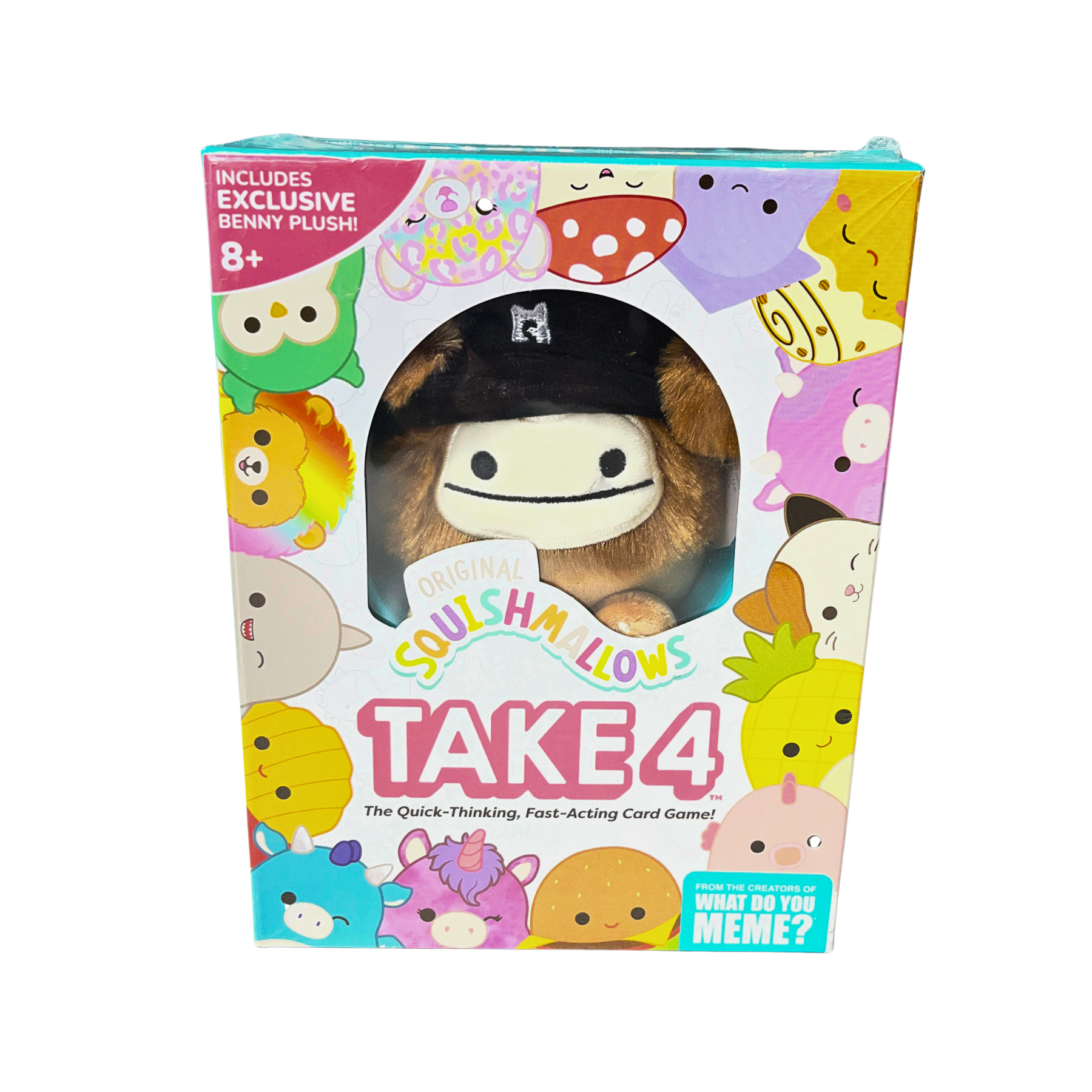 Brand new Squishmallows Take 4 card game! Still sealed in plastic. Comes with an exclusive Benny plush. Fun quick-thinking game for 2-4 players, game time is about 10-30 mins. For ages 8+. From the creators of What Do You Meme.
