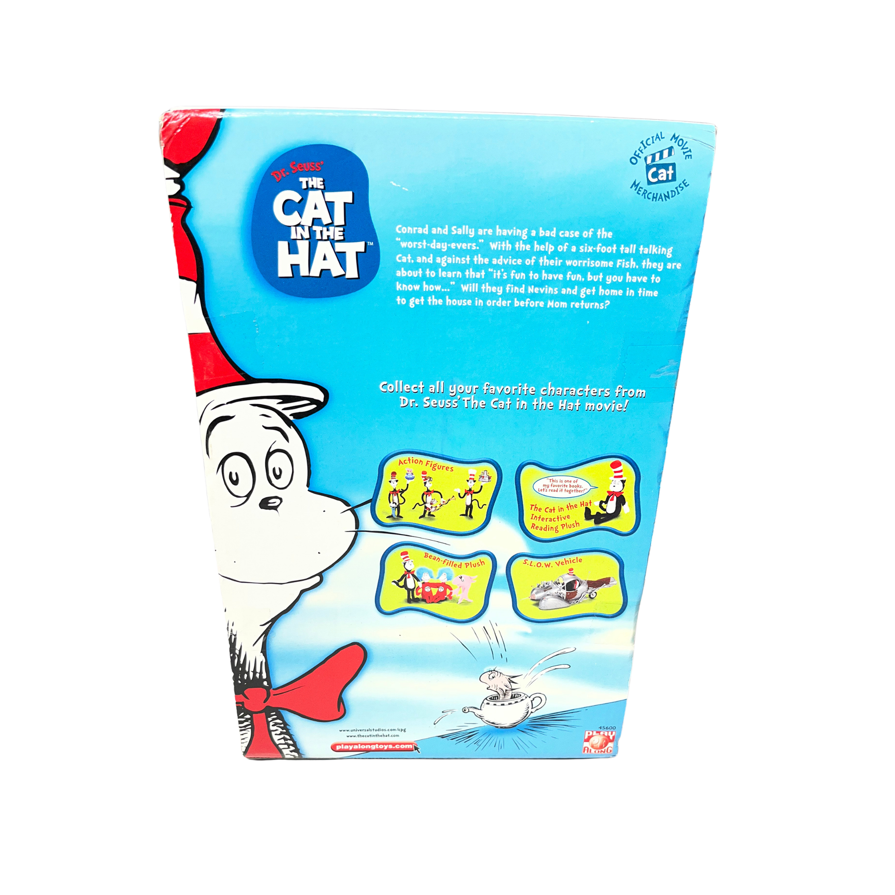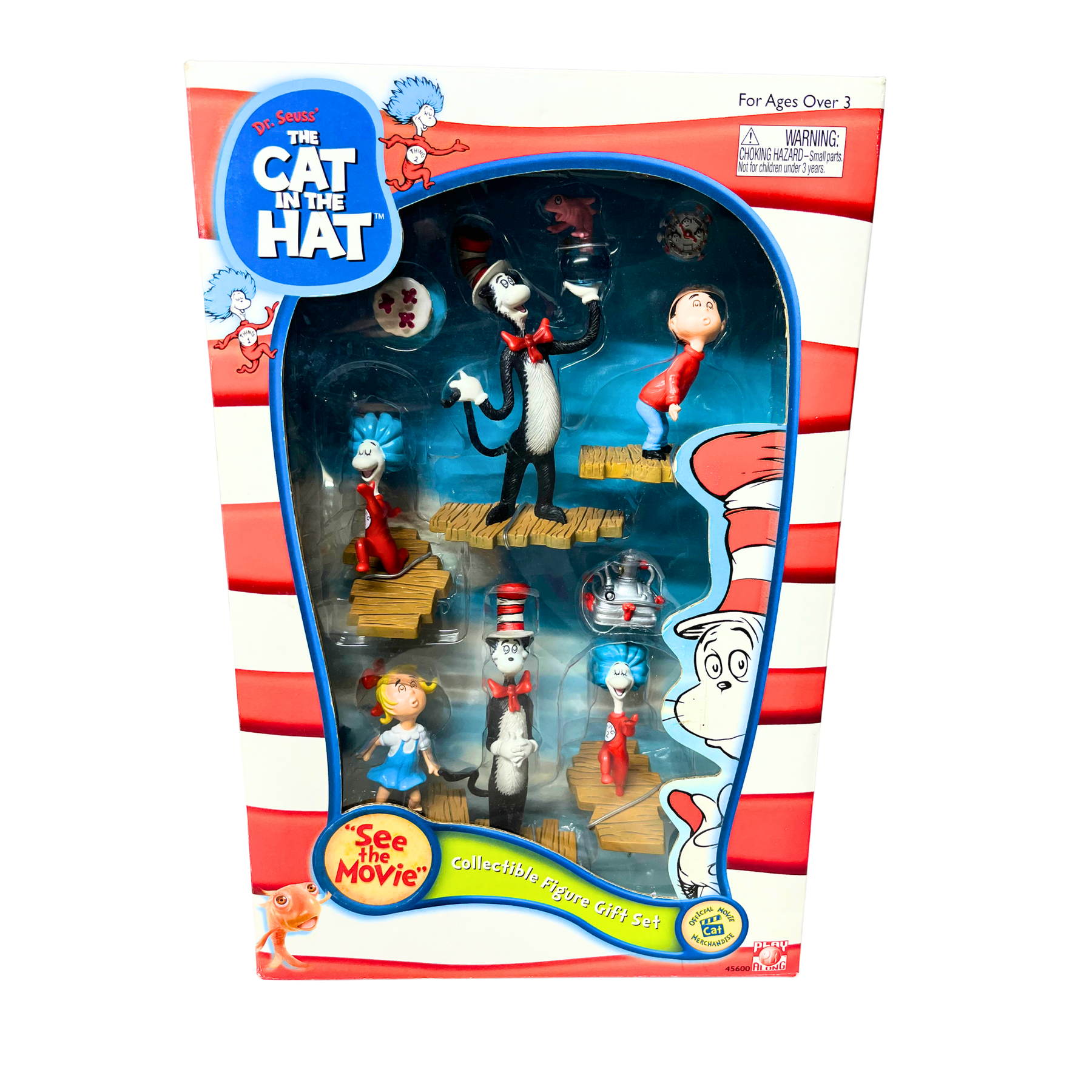 Dr. Seuss The Cat in the Hat collectible figure gift set. Has all the main characters from the movie like Cat in the Hat, Thing 1, Thing 2, Conrad, Sally, and Fish. Still in the original box, figures are sealed and untouched. Great for collectors or fans of the movie!