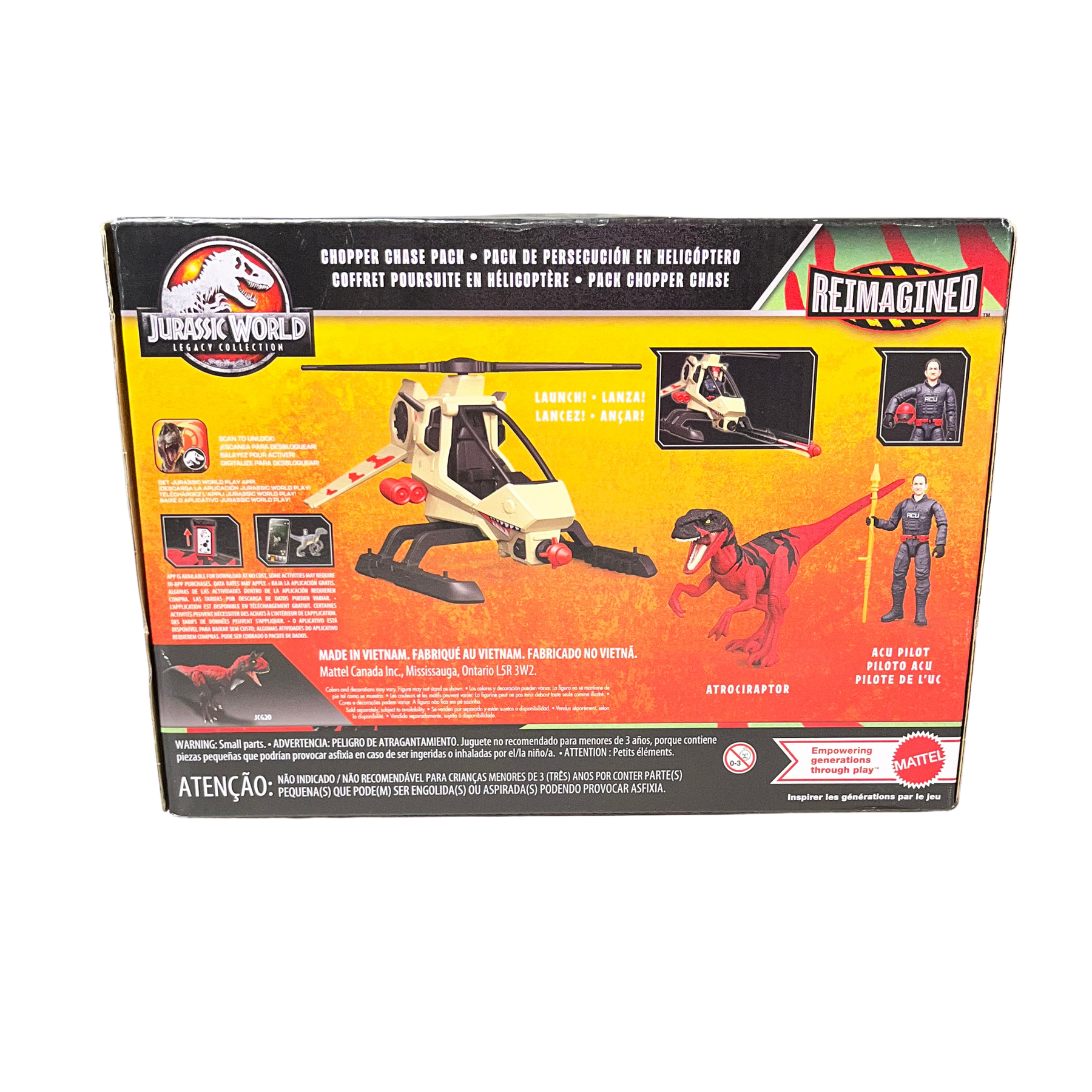 Toy package for 'Jurassic World' with helicopter and dinosaur figures on a white background